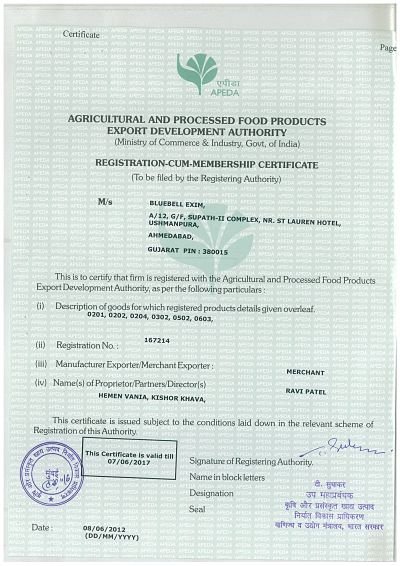 Range: This is to certify that firm is registered with the Agriculture processed food products Export Development Authority, as per following particular: description of goods for which registered products detail given overleaf. 0201,0202,0204,0302,0502,0603.