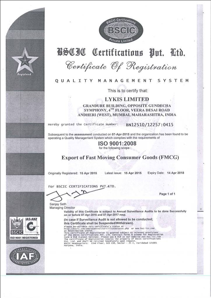 Name: ISO9001 Reference: BN12510/12257:0415 Issued By: Basic Certificate Pvt Ltd Validity Period: 2014-04-15 ~ 2018-04-14 Range: a Certification documents provide by suppliers.